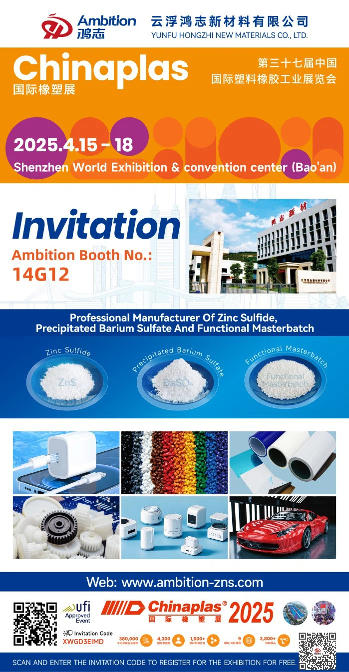 Yunfu Hongzhi New Materials Co., Ltd. (Ambition®) akan mempamerkan zink sulfida pigmen berkualiti tinggi, barium sulfat nano-precipitated, dan masterbatches berfungsi untuk plastik yang diubah suai di pameran. Kami berharap dapat bekerjasama dengan rakan-rakan industri global untuk menyediakan penyelesaian kos efektif, peningkatan kualiti, dan kecekapan. Sertai kami di barisan hadapan industri untuk meneroka cakrawala teknologi baru!