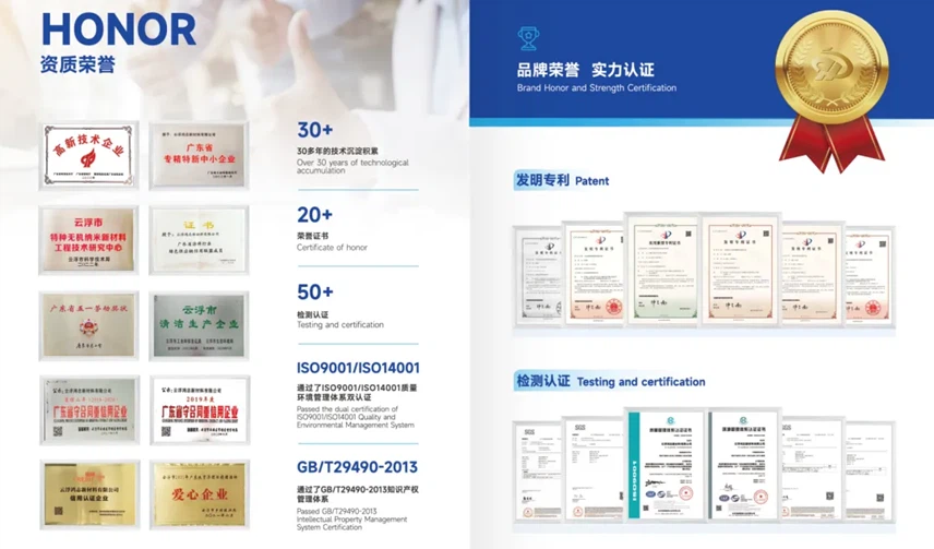 Sistem pengurusan yang ketat kami disahkan oleh ISO 9001 (Pengurusan Kualiti), ISO 14001 (Pengurusan Alam Sekitar), dan ISO 45001 (Pengurusan Kesihatan dan Keselamatan Pekerjaan). Dilengkapi dengan teknologi canggih dan instrumen ujian spektrum penuh, kami mengendalikan Pusat Penyelidikan Kejuruteraan Wilayah Guangdong untuk nanomaterials bukan organik khas, membolehkan penyesuaian cepat dan sokongan teknikal untuk pelanggan.